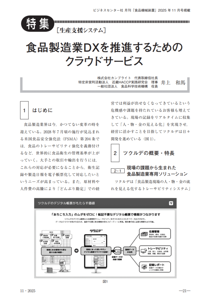 このたび、株式会社ビジネスセンター社が発行する専門誌『月刊 食品機械装置』2025年11月号に、弊社代表取締役社長・井上和馬の寄稿文が掲載されました。