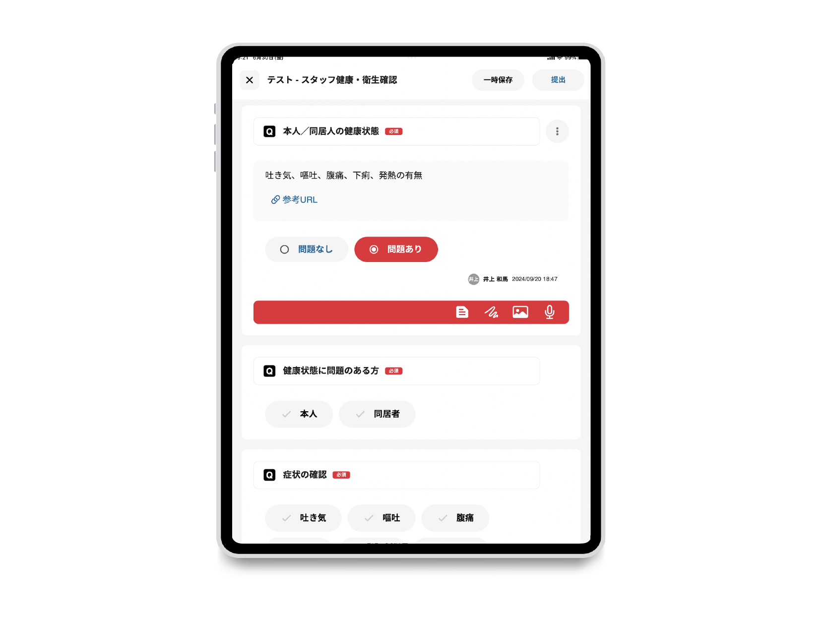 紙帳票に近い表形式と、質問分岐や画像表示ができる設問形式を併用。柔軟な入力画面で現場の使いやすさとデジタル記録を両立。